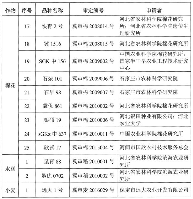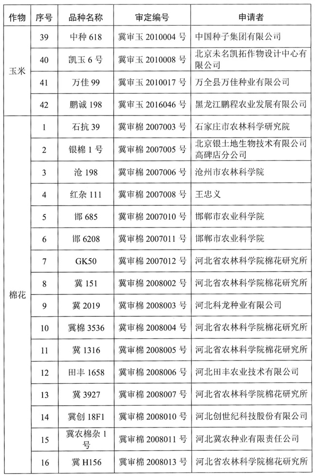 根據(jù)《種子法》和《主要農(nóng)作物品種審定辦法》有關(guān)規(guī)定,擬對42個玉米、25個棉花、2個水稻、1個小麥品種撤銷審定,現(xiàn)予以公示,公示期30天(自2022年4月6日至2022年5月5日)。公示期內(nèi)如有異議,請向河北省農(nóng)作物品種審定委員會辦公室書面反映。異議人應(yīng)當使用真實姓名,并提供手機號碼、電子郵件等聯(lián)系方式,異議單位書面材料應(yīng)當加蓋單位公章。