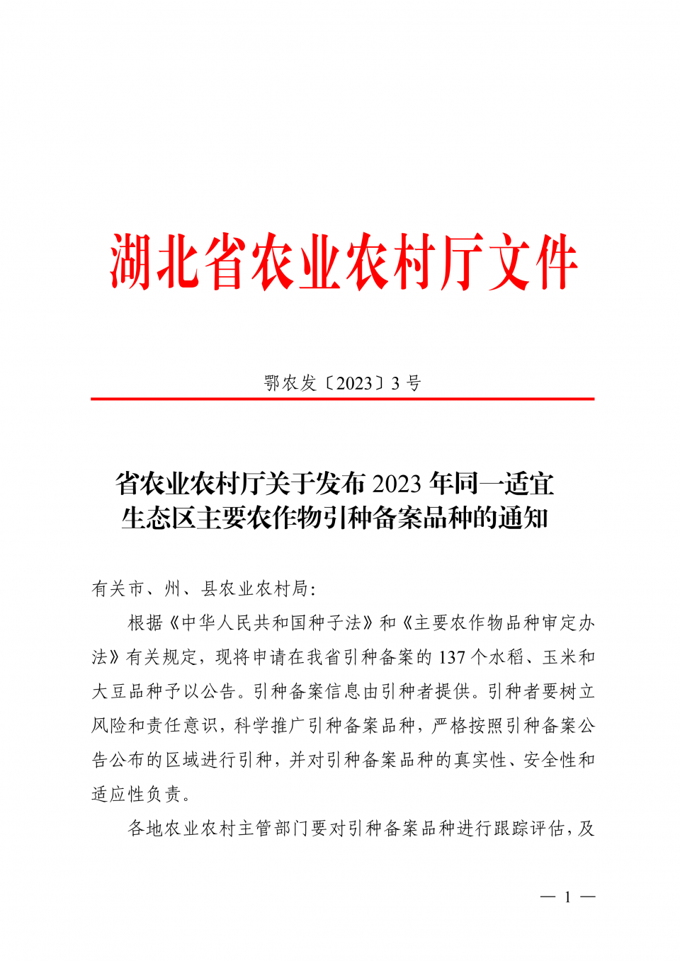 湖北省農(nóng)業(yè)農(nóng)村廳關(guān)于發(fā)布2023年同一適宜生態(tài)區(qū)主要農(nóng)作物引種備案品種的通知