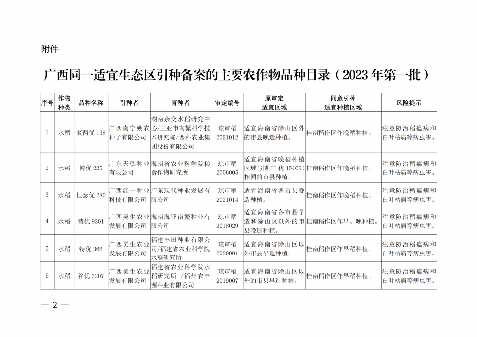 廣西同一適宜生態(tài)區(qū)引種備案的主要農(nóng)作物品種目錄(2023年第二批)