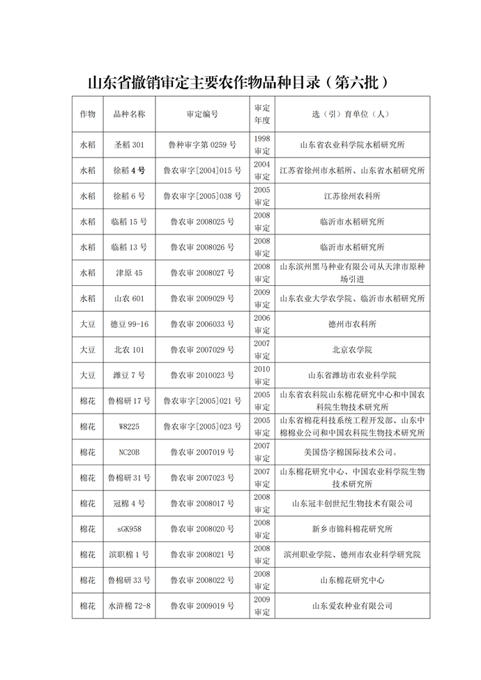 根據(jù)《中華人民共和國種子法》《主要農(nóng)作物品種審定辦法》有關(guān)規(guī)定,經(jīng)第七屆山東省農(nóng)作物品種審定委員會(huì)第十次會(huì)議審議,并經(jīng)為期一個(gè)月的公示,決定撤銷山東省農(nóng)作物品種審定委員會(huì)審定的79個(gè)玉米、小麥、水稻、大豆、棉花品種,現(xiàn)予公告。