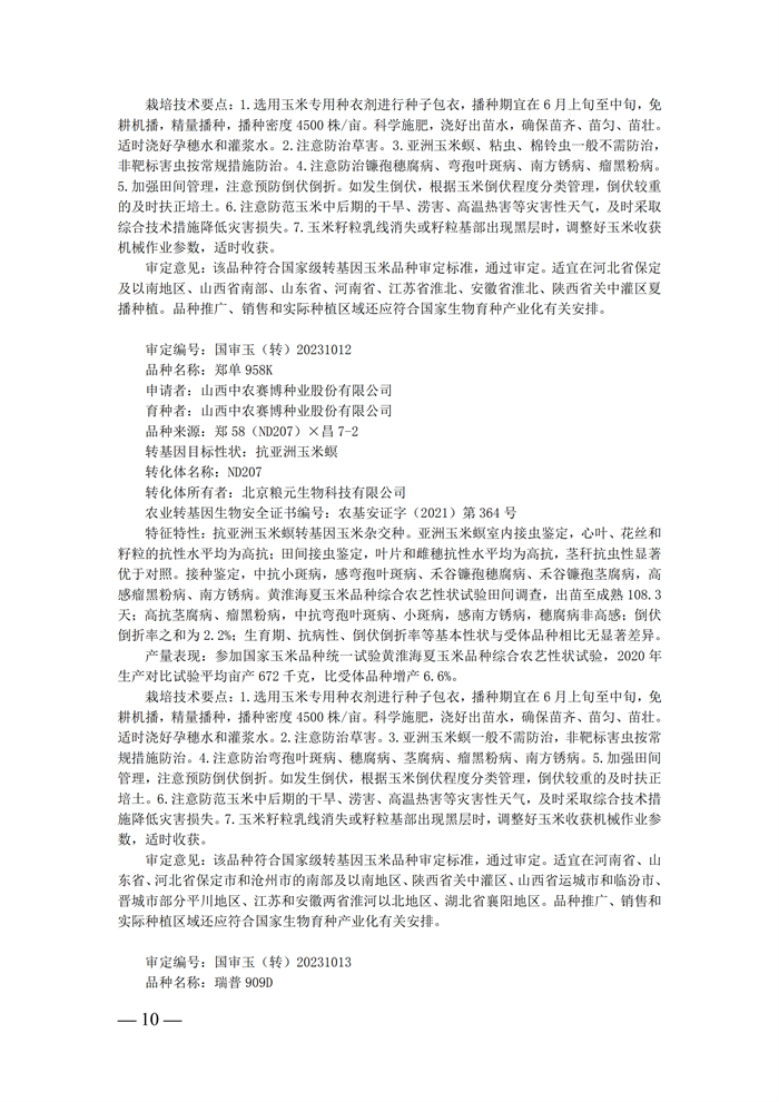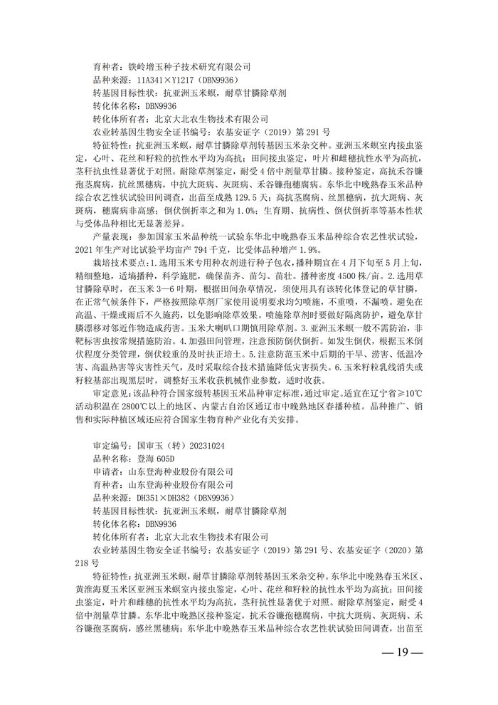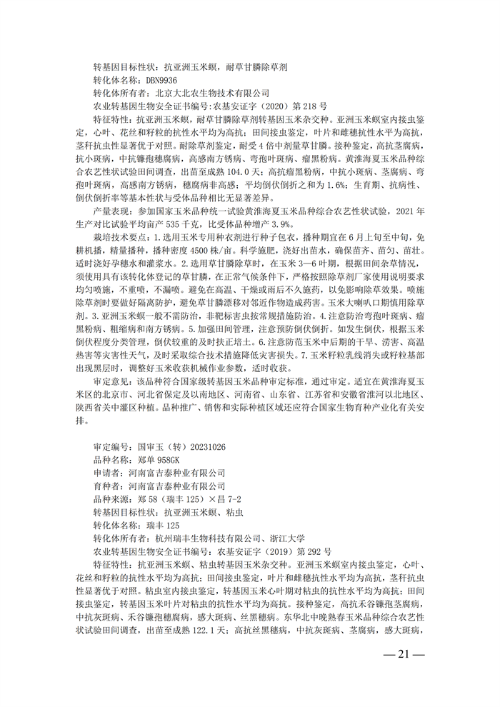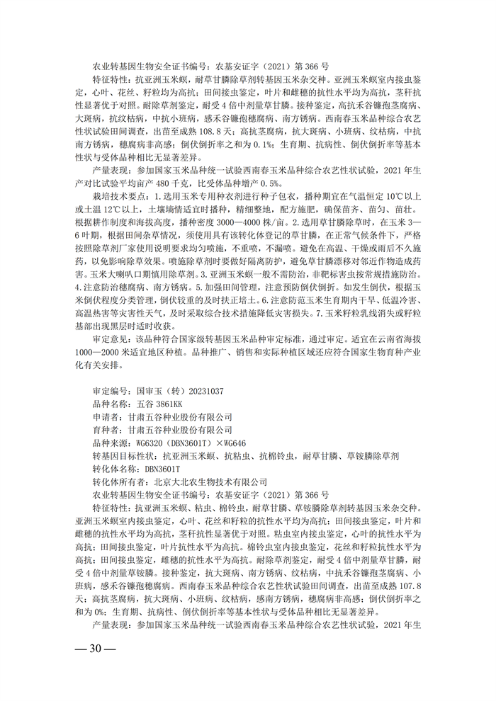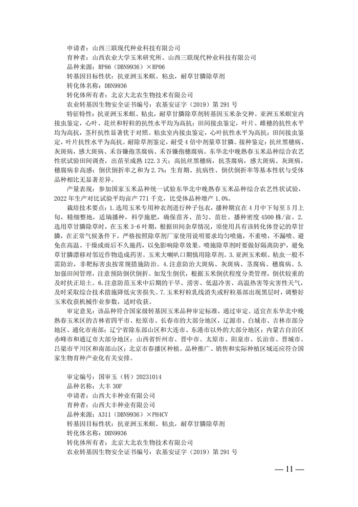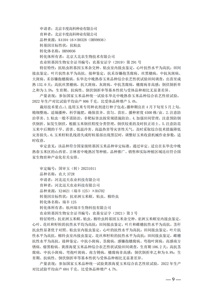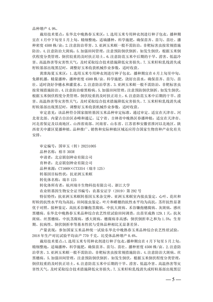 裕豐303D等51個轉(zhuǎn)基因品種審定信息