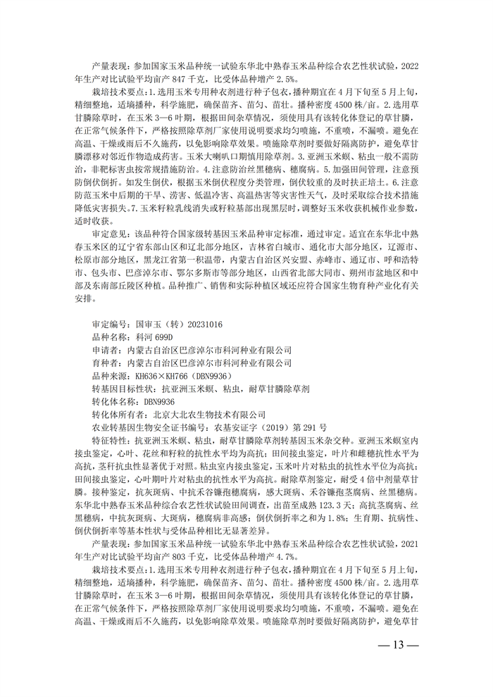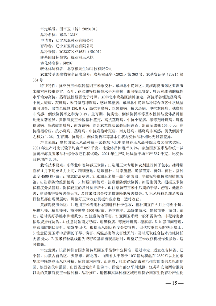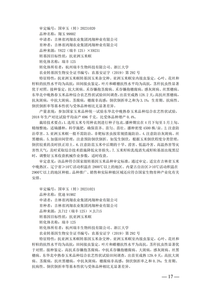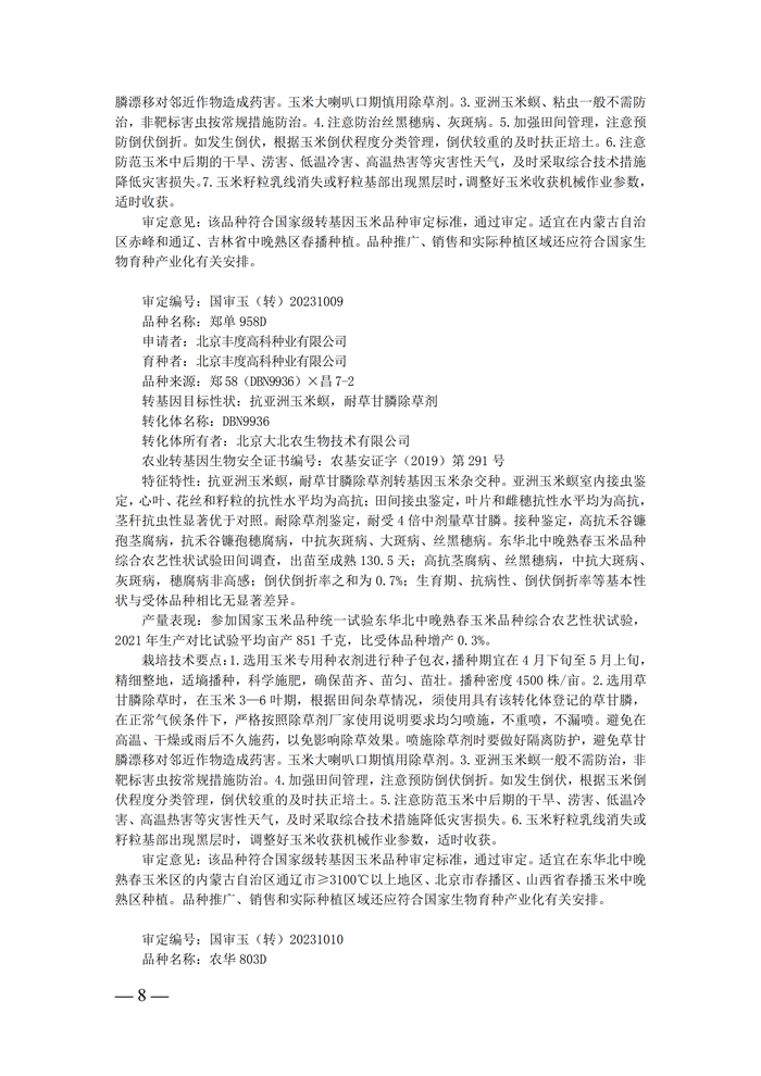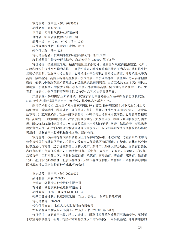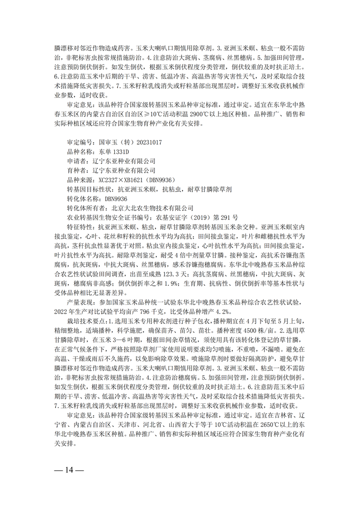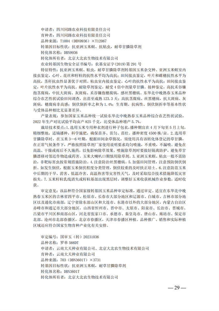 裕豐303D等51個轉(zhuǎn)基因品種審定信息