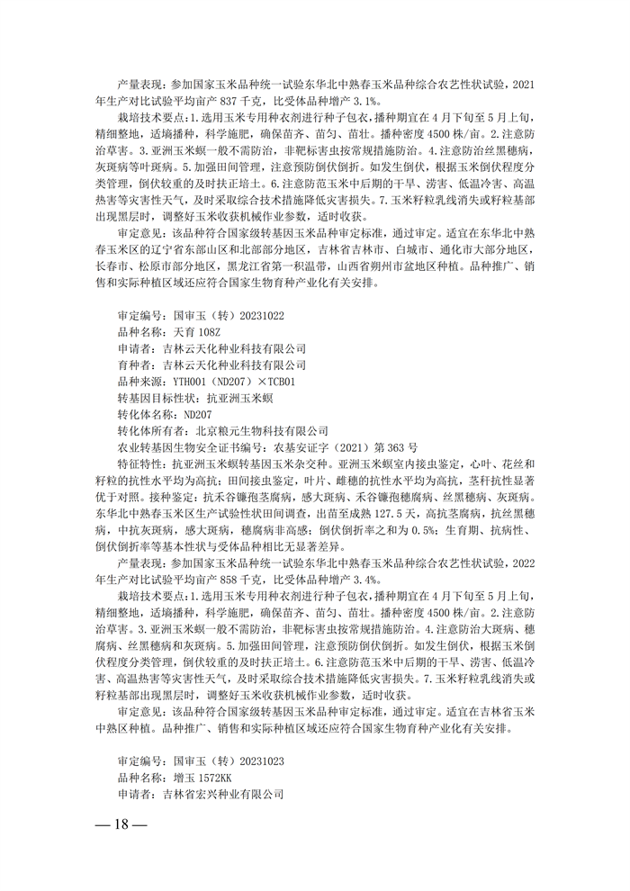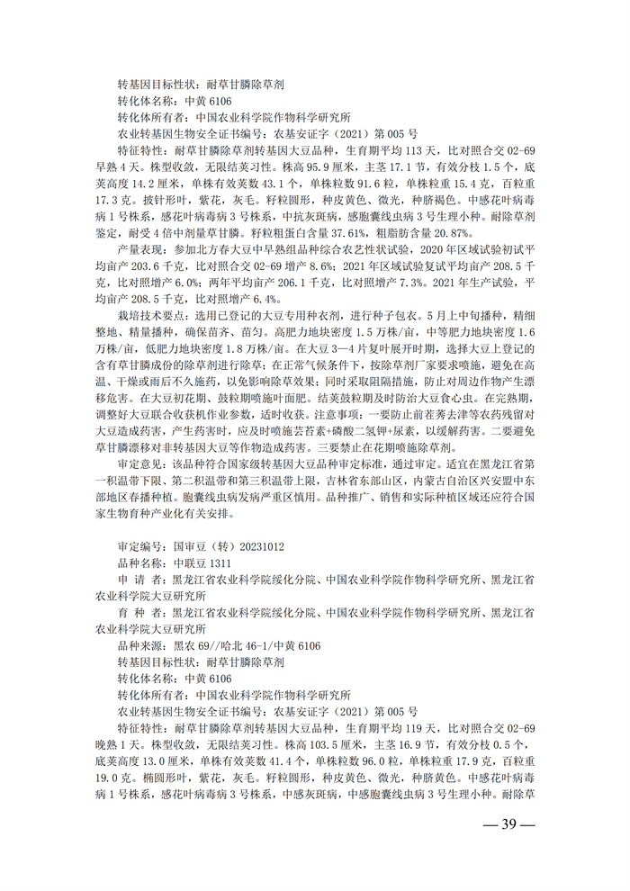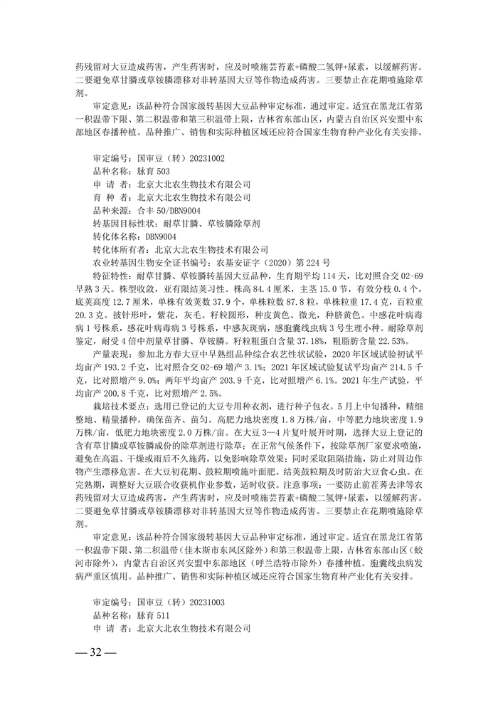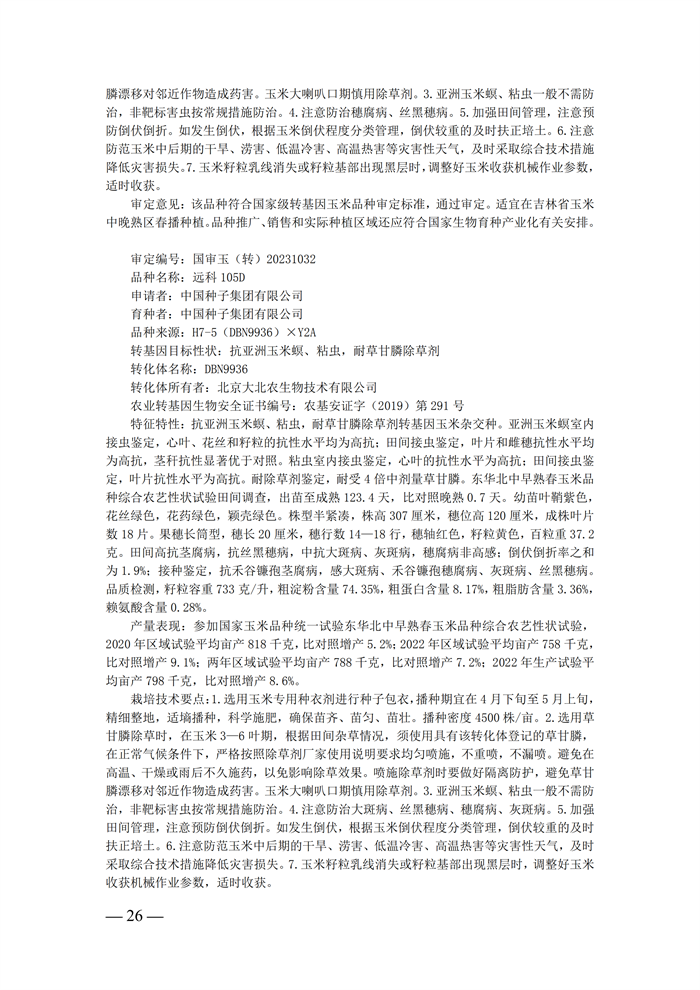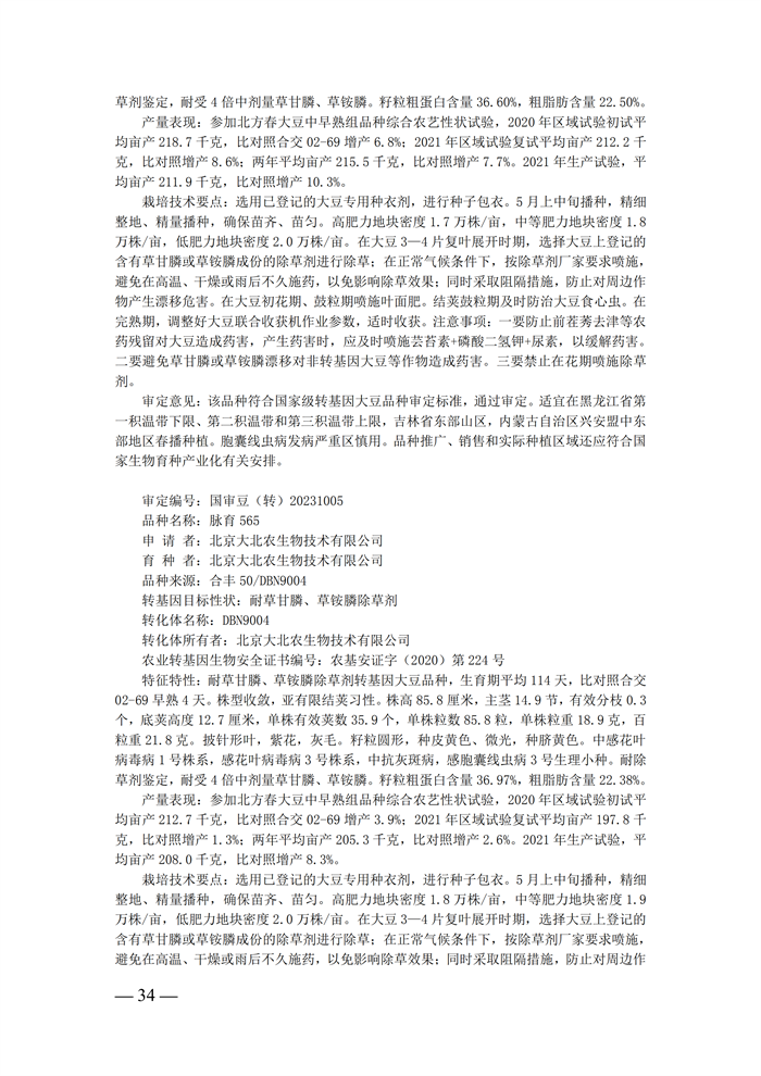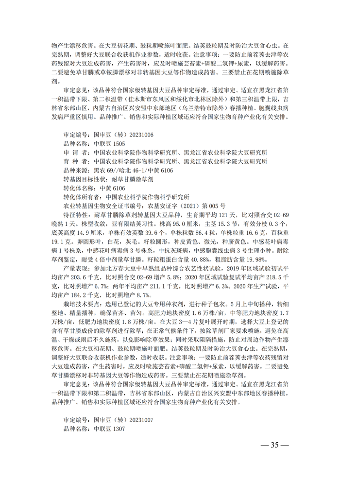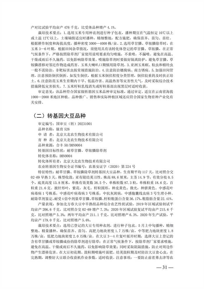 裕豐303D等37個轉(zhuǎn)基因玉米品種、脈育526等14個轉(zhuǎn)基因大豆品種,業(yè)經(jīng)第五屆國家農(nóng)作物品種審定委員會第四次會議審定通過,現(xiàn)予公告。