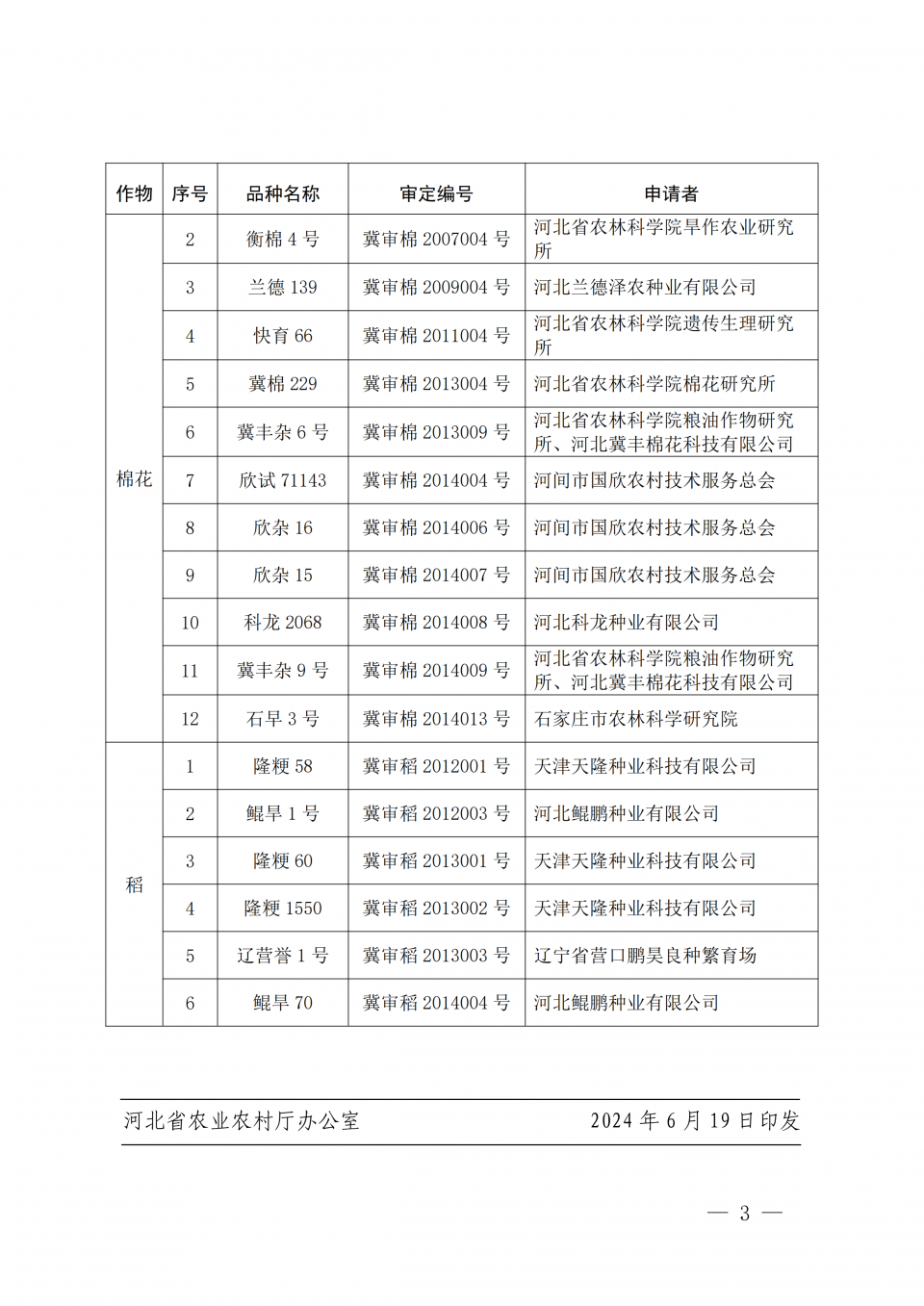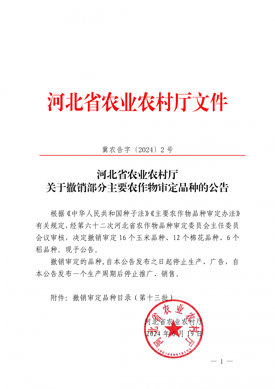 根據(jù)《中華人民共和國種子法》《主要農(nóng)作物品種審定辦法》有關(guān)規(guī)定,經(jīng)第六十二次河北省農(nóng)作物品種審定委員會(huì)主任委員會(huì)議審核,決定撤銷審定16個(gè)玉米品種、12個(gè)棉花品種、6個(gè)稻品種?,F(xiàn)予公告。