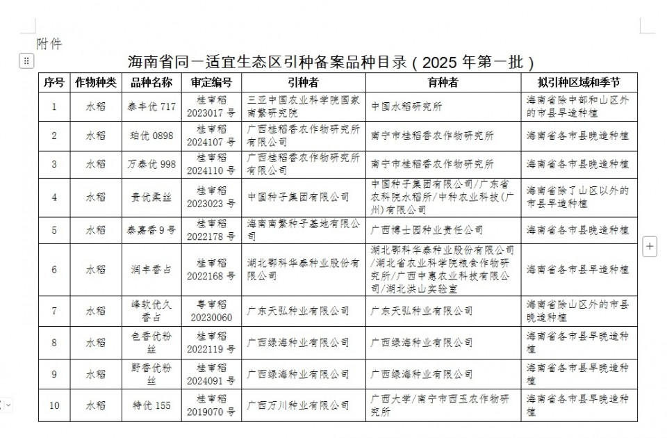 附件:海南省同一適宜生態(tài)區(qū)引種備案品種目錄(2025年第一批)