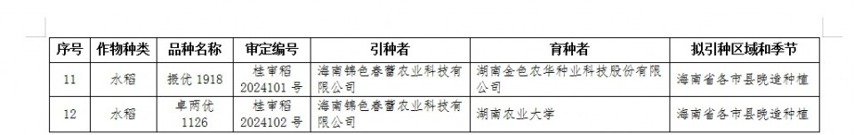 根據(jù)《中華人民共和國種子法》《主要農(nóng)作物品種審定辦法》《海南省農(nóng)業(yè)廳關(guān)于開展同一適宜生態(tài)區(qū)主要農(nóng)作物審定品種引種備案工作的通知》(瓊農(nóng)字〔2017〕79號)等相關(guān)規(guī)定,經(jīng)初審,泰豐優(yōu)717、珀優(yōu)0898、萬泰優(yōu)998、貴優(yōu)柔絲、泰嘉香9號、潤豐香占、峰軟優(yōu)久香占、色香優(yōu)粉絲、野香優(yōu)粉絲、特優(yōu)155、振優(yōu)1918、卓兩優(yōu)1126等12個水稻品種符合主要農(nóng)作物同一適宜生態(tài)區(qū)引種備案條件,現(xiàn)予公示,公示期為2025年6月11日至2025年6月17日。公示期內(nèi)如有異議,可向海南省農(nóng)作物品種審定委員會辦公室書面反饋,同時提供辦公電話、手機號碼、電子郵件等聯(lián)系方式,并由異議人本人簽字或加蓋異議單位公章。