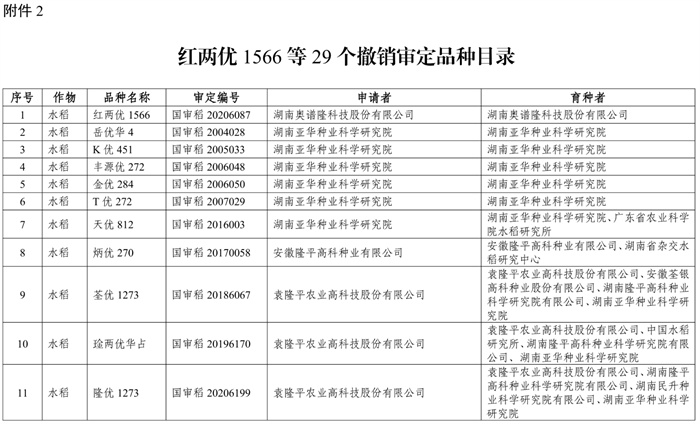 2. 紅兩優(yōu)1566等29個(gè)撤銷審定品種目錄