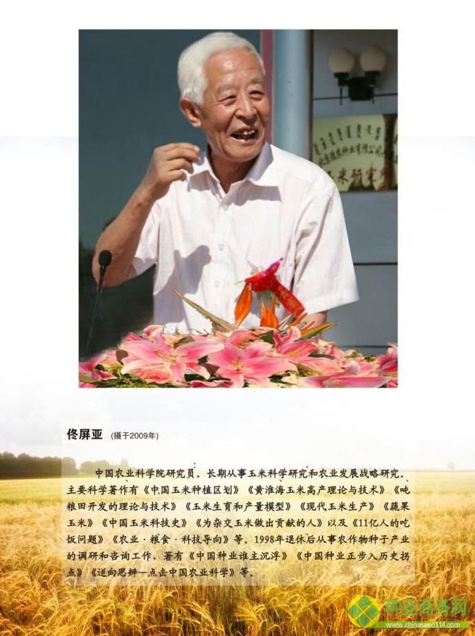 作者簡介 佟屏亞,1中國農(nóng)業(yè)科學院作物科學研究所研究員.a長期從事玉米科學研究和農(nóng)業(yè)發(fā)展研究.a主要科學著作有:《中國玉米種植區(qū)劃》、《玉米生育和產(chǎn)量模型》、《現(xiàn)代玉米生產(chǎn)》、《噸糧田開發(fā)的理論與技術(shù)》、《中國玉米科技史》、《逆向思辯——點擊中國農(nóng)業(yè)科學》以及《中國種業(yè)誰主沉浮》、《中國種業(yè)正步入歷史拐點》等.a另著有《農(nóng)作物史話》、《為雜交玉米做出貢獻的人》等科普著作.a