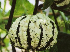 瓜皮。扁球形小果,瓜皮色為綠白條紋相間,像西瓜皮,果徑4-6厘米,果高4厘米左右,單果重80克,果肉淡黃色,肉厚1-2厘米,每株掛果5-10個,以主蔓結瓜為主。觀賞性強,耐貯存。