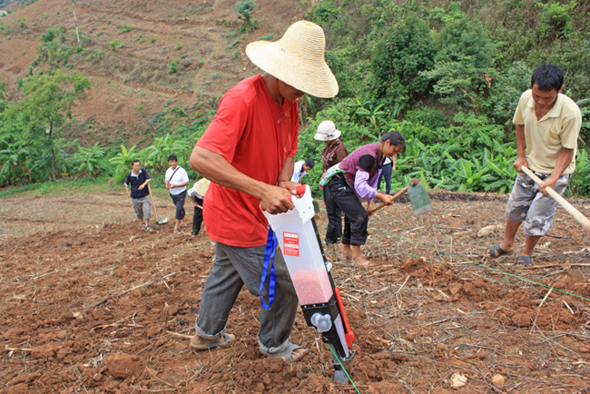 4、播種:將裝好種子的單筒播種器,移至所需播種地表上,用力壓下手柄,到位后用力拔出,復(fù)位后進(jìn)行下一次播種動(dòng)作。