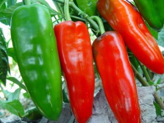 辣椒,別名:牛角椒、長辣椒、菜椒、燈籠椒,拉丁文名:Capsicum annuum L.,茄科、辣椒屬一年或有限多年生草本植物。莖近無毛或微生柔毛,分枝稍之字形折曲。葉互生,枝頂端節(jié)不伸長而成雙生或簇生狀,矩圓狀卵形、卵形或卵狀披針形,全緣,頂端短漸尖或急尖,基部狹楔形;花單生,俯垂;花萼杯狀,不顯著5齒;花冠白色,裂片卵形;花藥灰紫色。果梗較粗壯,俯垂;果實長指狀,頂端漸尖且常彎曲,未成熟時綠色,成熟后成紅色、橙色或紫紅色,味辣。種子扁腎形,淡黃色。