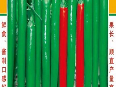 該品種屬中熟長線椒品種。植株生長勢較強,株型好,分枝多,葉片小,果順直,長22厘米左右,果寬約1.5厘米。青果深綠色,老熟果紅色鮮艷,果實硬度好,耐儲運,單果重22克左右,口感好,味辣,有香味,坐果性好,綜合抗性強,適合蘚椒上市或醬制加工。