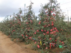 四:煙富3:該品種由長富2號中選出。多年的實(shí)踐證明,煙富3號是6個(gè)優(yōu)系紅富士(煙富1-6號)中綜合性狀最好的品種。該品種果實(shí)大,平均單果重300克;果實(shí)圓至長圓形,果形端正;樹冠上下、內(nèi)外著色均好,片紅,全紅果比例78-80%,色澤濃紅艷麗,光澤美觀;果肉淡黃色,肉質(zhì)爽脆,汁液多,風(fēng)味香甜;可溶性固形物含量14.8-15.4%,果實(shí)硬度8.7-9.7千克/厘米2。該品種10月中下旬成熟,結(jié)果早,豐產(chǎn)穩(wěn)產(chǎn),適應(yīng)性強(qiáng)。套紙袋的果實(shí)摘袋后5-7天即達(dá)滿紅,尤其在秋季高溫、晝夜溫差小時(shí),比其它富士品種有明顯的著色優(yōu)勢。